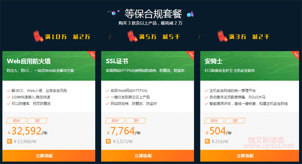 A)等保合规套餐一次性新购以下9款产品中任意3款产品(年付)规格,通过购物车一键下单达到以下金额即可立即享受满减:满3万元减2000元;满5万元减5000元;满10万元减20000元 产品包括以下:Web应用防火墙、态势感知、安骑士、SSL证书、堡垒机、数据库审计、云防火墙网站威胁扫描系统、DDoS防护包。分开购买无法实现满减须使用购物车一起下单。