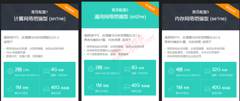 这三款机型的CPU内存比分别是1:2、1:4和1:8,分别对应小型业务、中型业务和大型业务。一般我们个人业务使用计算网络增强型sn1ne实例足够用了,可以支撑日PV几万访问量的情况。内存增强型一般用于内存分布式缓存应用,一般只有企业级才会用到,我们个人网站业务是用不到这么大配置的。