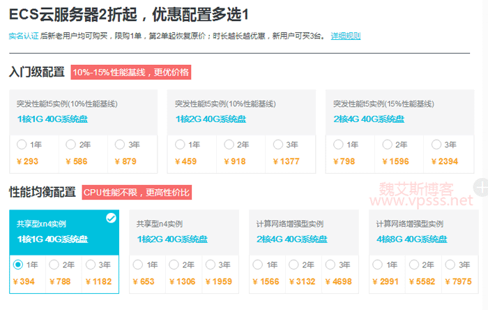 均衡性能配置分为 1 核 1G、1 核 2G、2 核 4G,4 核 8G。两种类型均是 40G 系统盘。