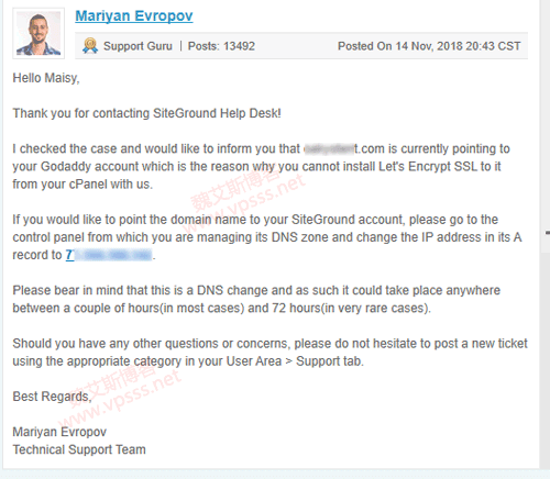 其实对于这个回答老魏感觉客服说的不太透彻,对于新手来说更是看不懂了。不过凭借着经验老魏让网友把NS记录从godaddy换成了siteground。
