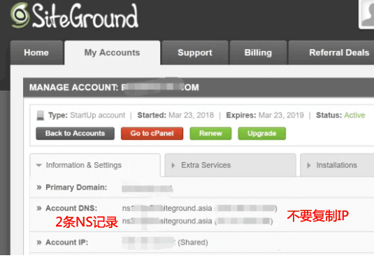 2、Siteground的NS记录在下图的位置能够找到,只要那两条NS地址,不要复制IP。