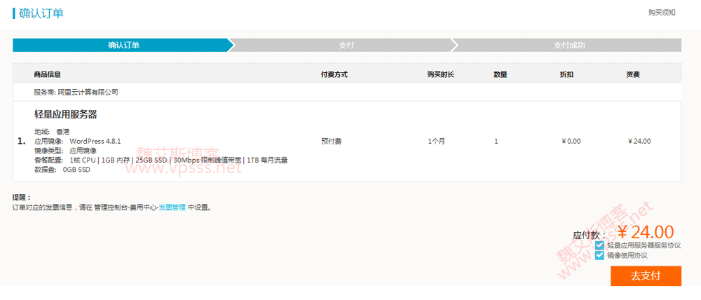 这里核对一下订单配置、地域、时长、应付款等几个项目。