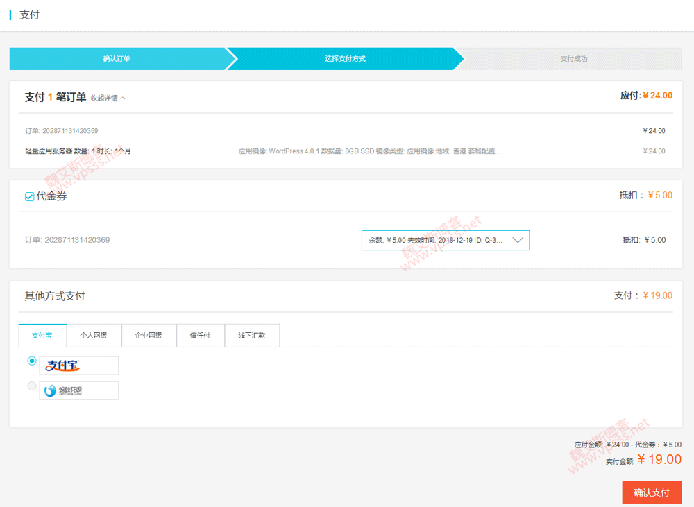 这里最重要的就是勾选代金券,系统自动给出可用的代金券及金额。支付方式有支付宝、个人网银、企业网银、信任付、线下汇款等等,最后确认支付。