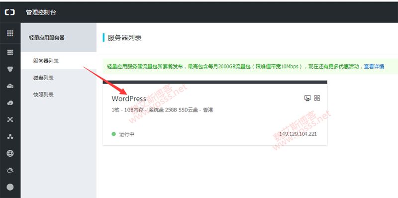 9、从阿里云管理控制台的最近访问中,进入轻量应用服务器列表,能看到配置、地域、IP、主机状态等,像下图箭头所示一样点进入管理页面,就可以进行建站操作了,详细内容后面单独写文章说。
