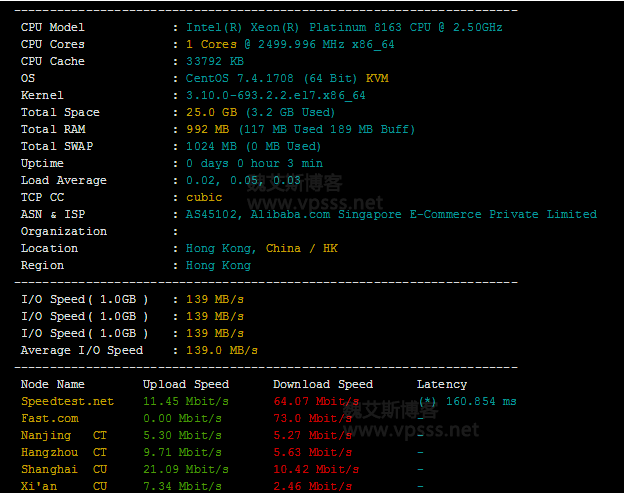 看测试结果阿里云轻量应用服务器是KVM架构,目前国内外的主流架构。I/O速度139MB/s,SSD硬盘够强悍的,国内南京节点、杭州节点、上海节点、西安节点的下载速度都还可以。