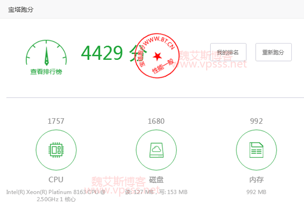 用宝塔跑分测试下成绩吧,CPU的份1757分还是蛮不错的,总体看1核1G配置能有这个分数还是挺可以的,整体性能完全可以支撑相应级别的业务。