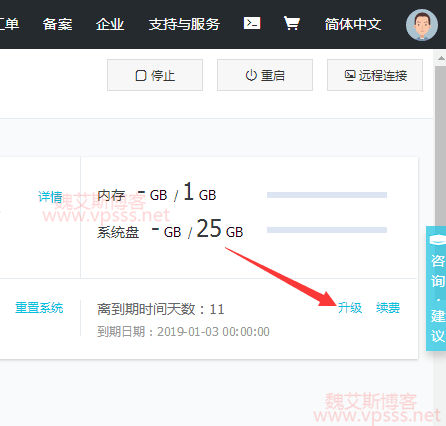 1、登陆阿里云控制台的轻量应用服务器管理后台,在“概览”的右侧点击“升级”。