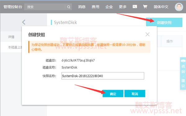 前往生成快照页面,创建快照并给起个名字。页面提示需要十几分钟到几十分钟生成快照。