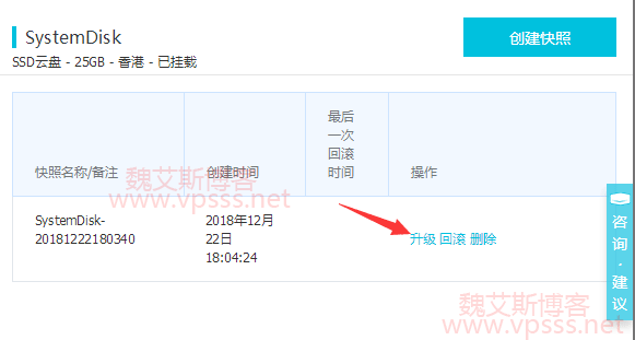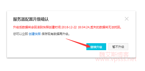 轻量应用服务器为新手考虑的十分周到,这里提示:升级后数据会回滚到快照创建时间点,丢失的数据将无法找回。这里大家要注意用快照备份好你的数据。