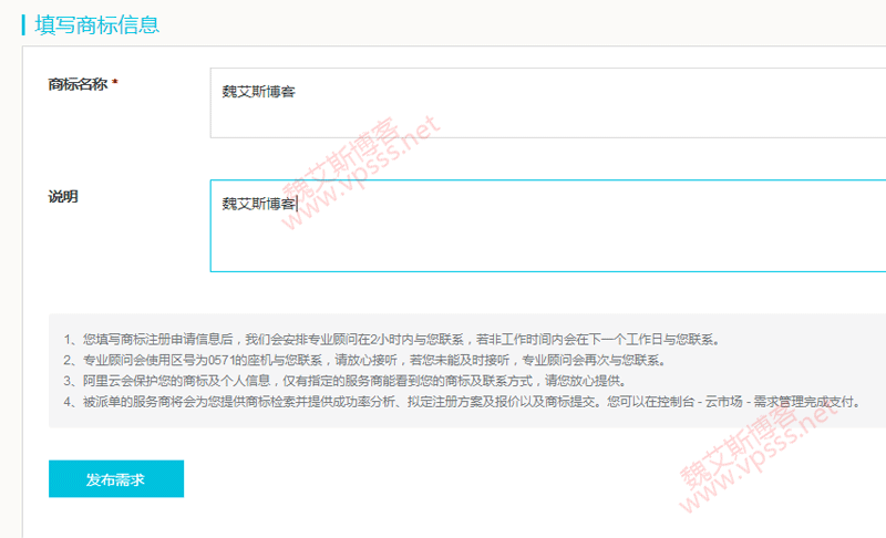 点我打开阿里云商标注册页面,选择专家申请或担保注册申请,新页面填写商标信息。如下图所示发布需求之后,在工作日2小时之内专业顾问会与你联系。服务商会为您提供商标检索并提供成功率分析、拟定注册方案、报价及商标提交服务,几乎不用你亲自操作。