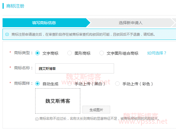 填写商标类型,商标名称。如果你自己准备好了商标图样就手动上传,如果没有那就自动生成。