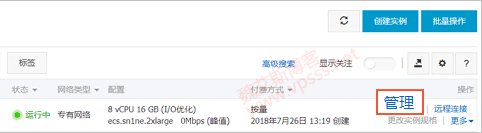 1、登录ECS管理控制台,选择地域,在左侧导航栏中单击实例,找到需要创建快照的实例,单击管理。