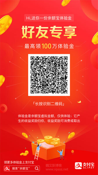 老魏看到有人已经领取到一百万体验金了,用手机支付宝app扫描下面的二维码可以领取到最高100万体验金。要知道这些虽然是虚拟体验金,放到你余额宝里面几天也能产出不少钱呢,收益归你自由支配哦。