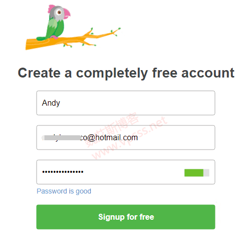 1、先要去 https://www.tawk.to 这个网站注册会员。点击页面中间绿色的sign up free按钮,输入名字、邮箱、密码,免费注册。