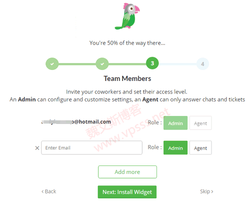 4、添加team成员。邀请你的同事加入,设置不同权限的管理员。Admin可以设置和自定义沟通工具,相当于管理员、老板这个角色。Agent只能在线交流和回复工单,相当于员工或在线客服。
