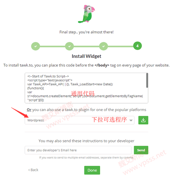 WordPress使用tawk.to功能是很容易的,安装插件就行了。