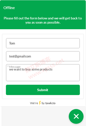 如果你人不在线的话,网页右下角就看到一个邮箱的图标,点开就像下图那样留言。留言会发送到你的邮箱,用手机可以及时看到并回复。