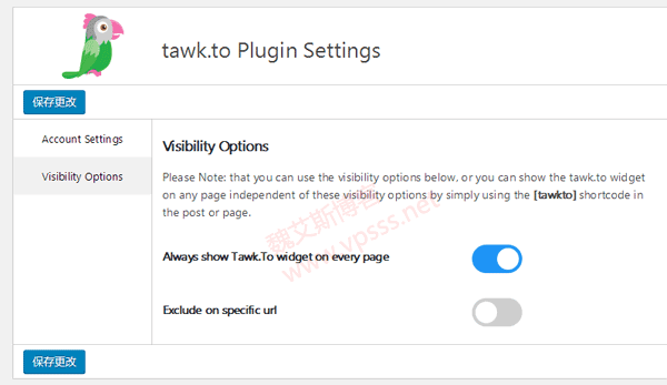 visibility options里面可以设置是否全部页面都添加这个聊天挂件 always show tawk. to widget on every page。