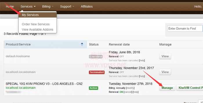 2、在搬瓦工后台点击”My Services”,找到对应产品的”Manage”。