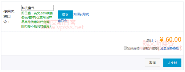 老魏尝试了一下 .com 续费的价格,原价格69元,使用优惠码之后是60元。动动手就能省下来9块钱,也不错哦。如果你批量注册域名的话,是能省下不少钱钱的。