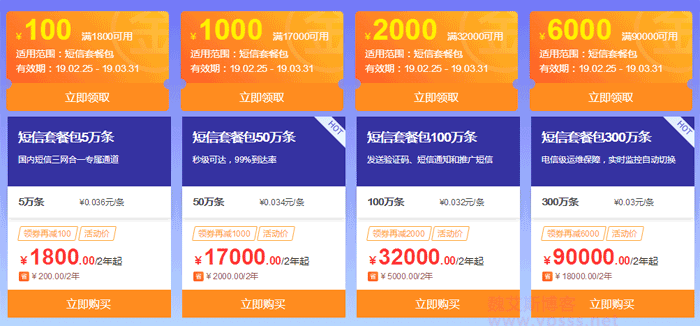 2、企业版新人礼包,支付19.9元即可获得700条国内短信+30条国际短信+30分钟语音通知 +30分钟号码隐私保护通话时长+30兆物联网+5000次号码认证。二、国内通用短信套餐包短信套餐包基础折扣叠加满减券,单价低至0.028元/条。活动期间,短信套餐包订单金额满1800减100,满17000减1000,满32000减2000,满90000减6000。点我直达