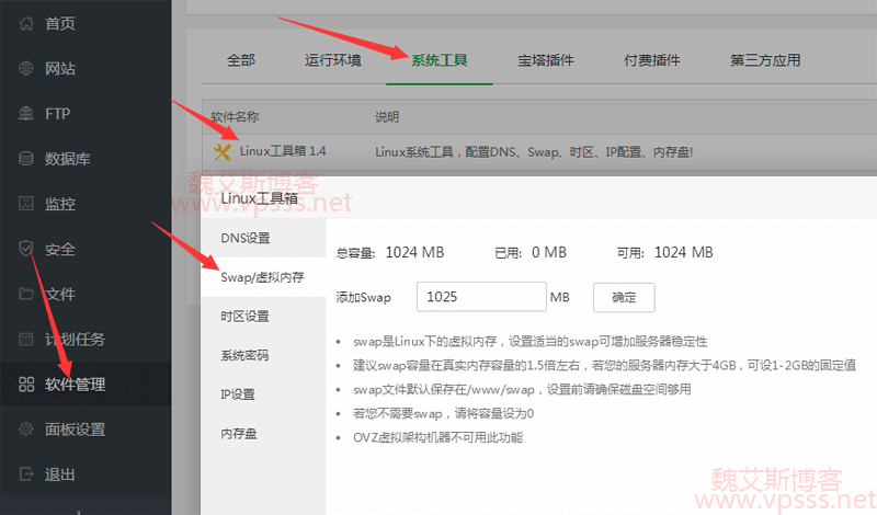 进入宝塔面板,软件管理,系统工具,Linux 工具箱中,找到 swap 虚拟内存并进行设置。