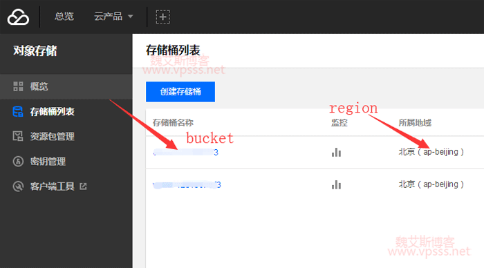 存储桶列表中的存储桶名称,也叫 Bucket,所属地域,也就是 region
