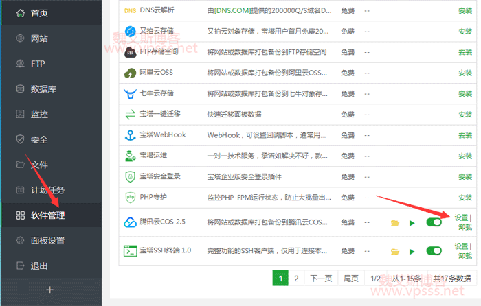 安装之后在“软件管理”中能看到腾讯云 COS,最右侧点击安装,然后点击设置。