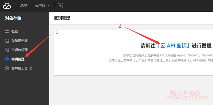 2、点我打开腾讯云,搜索对象存储,密钥管理,点击右侧的“云 API 密钥”。