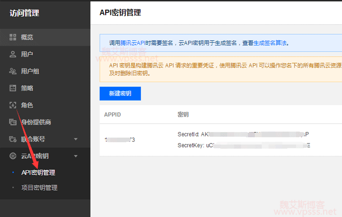 在 API 密钥管理中,有密钥的 secret_id 和 secret_key。