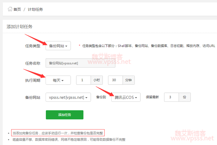 4、在宝塔面板的计划任务中,分别添加备份网站和备份数据库两个任务。