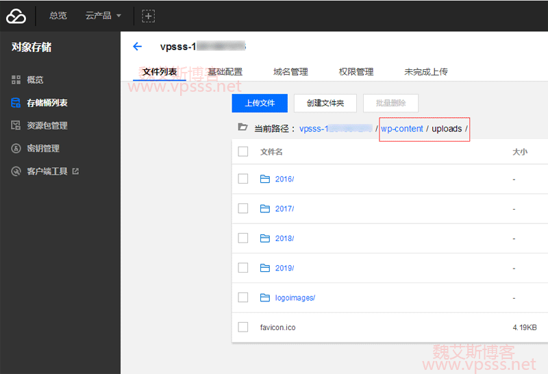 登陆上去之后能够看到新建的存储桶。新建两个文件夹,wp-content,在它下面再建立 uploads,属性都是继承。这样就和源服务器的 wordpress 图片文件路径完全相同了。
