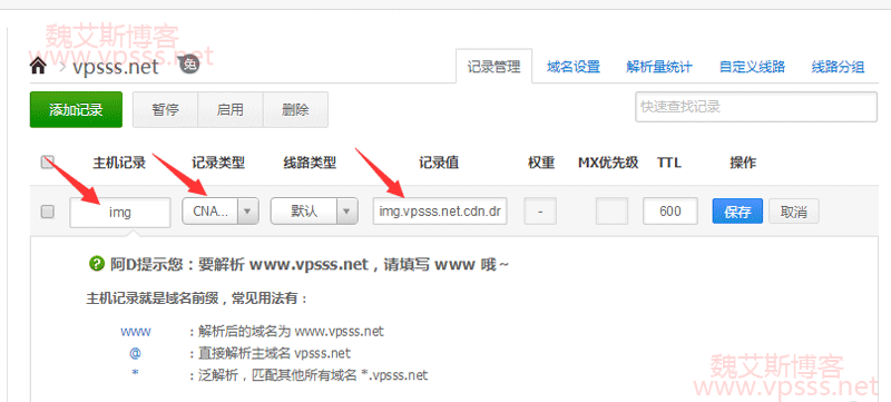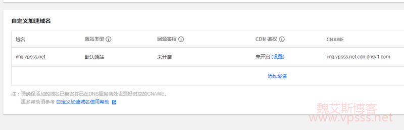 比如老魏使用 img.vpsss.net 作为图片的域名前缀,那么就点击下图中的添加域名,把 img 添加进去,其他的都不要改,直接保存即可。这个前缀你可以自定义,什么 img 啦,tupian 啦等等,自己能看懂就行了,不过最简单明了一看就懂还是用 img。
