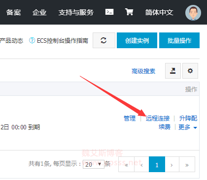 点我打开阿里云网站,登陆后进入管理控制台的云服务器 ECS 列表,右上角点击远程连接。