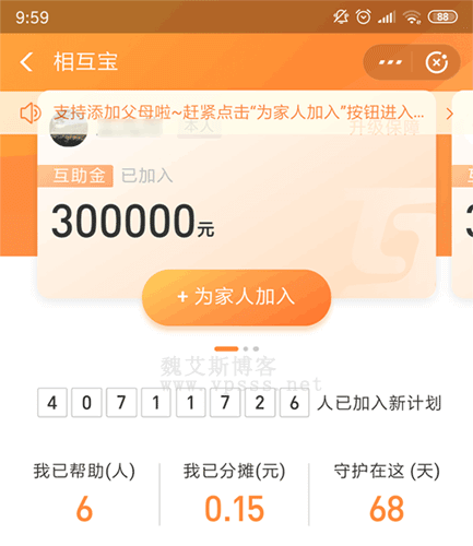 老魏已经给自己和家人都加入了相互宝,能够看到每个人的互助金是 30 万元,加入的这 68 天中,帮助过 6 个人,分摊费用 0.15 元。这 6 个人都是给付保额 30 万元的,他们在加入相互宝的时候,也仅仅是每次为互助的人付出几分钱而已。
