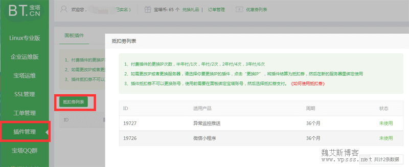 点我登录宝塔官网 >> 插件管理 >> 抵扣券列表