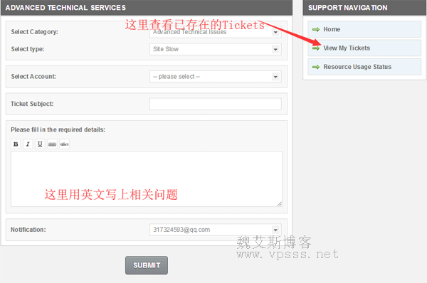 3、用英文描述问题发给 SiteGround,客服会在第一时间回复你。下图右上角的 view my tickets 可以查看客服的回复,并且能收到邮件通知。