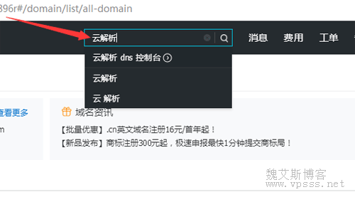 领取上面的代金券后,在网页上面的搜索框中搜索“云解析”,点击“云解析 dns 控制台”就可以直达了。