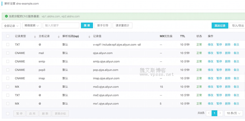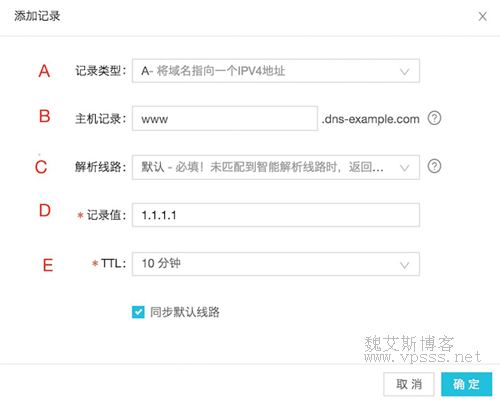 主机记录:输入www,将域名解析为 www.dns-example.com 了。如果这里输入 @ ,那么就解析成 vpsss.net 了。这两个可以分开添加,也可以根据需要只添加一个;