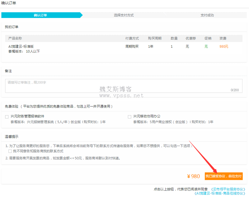 确认订单页面仔细核对套餐版本,付费周期,和费用,无误后可以留言,最后点击下面按钮去支付。