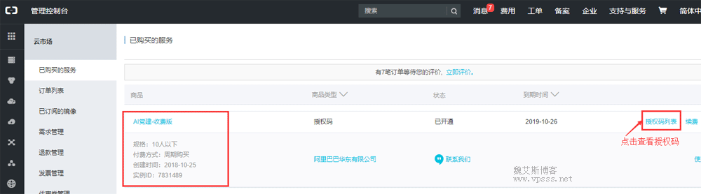 进入控制台页面,看到已购买的服务。点击【授权码列表】可查看产品授权码。