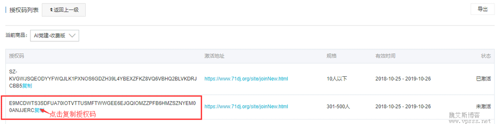 在授权码列表页面中,点击【复制】链接就能复制授权码。