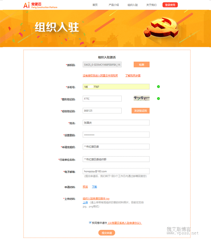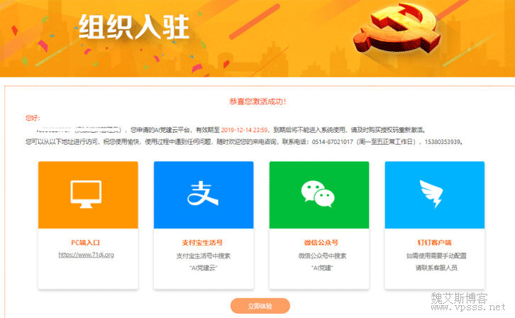 如下图,提交入驻材料后,系统立即开通使用账号,点击【立即体验】即可为您链接至AI党建云的管理后台。