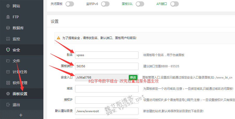 1、首先对宝塔面板登陆地址进行安全加固。目的是让别人猜不出面板的登录地址。进入面板设置后操作如下: