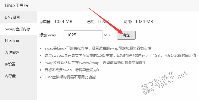 4、软件管理 >> Linux工具箱 >> Swap/虚拟内存,确定。
