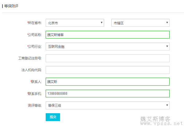打开页面后,按照要求填写表单,包括地址、公司名称、行业、联系人、手机、评测等级,提交后等待服务人员联系你。
