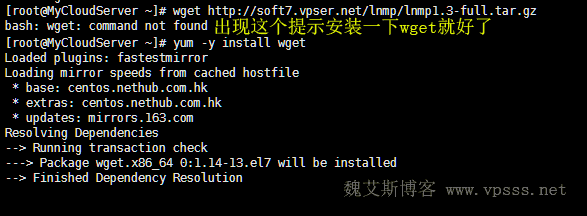 有一次魏艾斯博客想下载 lnmp 一键包,因为安装的是最小版的 CentOS 系统,SSH 命令行提示 bash: wget: command not found,那么解决这个问题最简单的方法就是安装一下 wget。