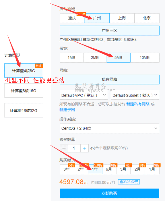 2、计算型 4核 8G内存 5M带宽,广州/上海/北京价格是 4597.08元/年。最大网络收发包能力 60万 PPS,内网带宽能力 3.0万 Gbps。