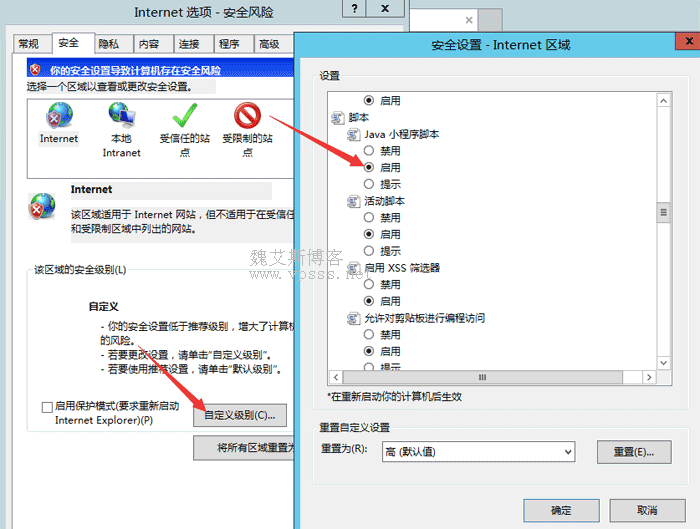 在“安全”选项卡中,点击下面的 ”自定义级别“,在弹窗中找到 Java 小程序脚本,选择启用,确定。