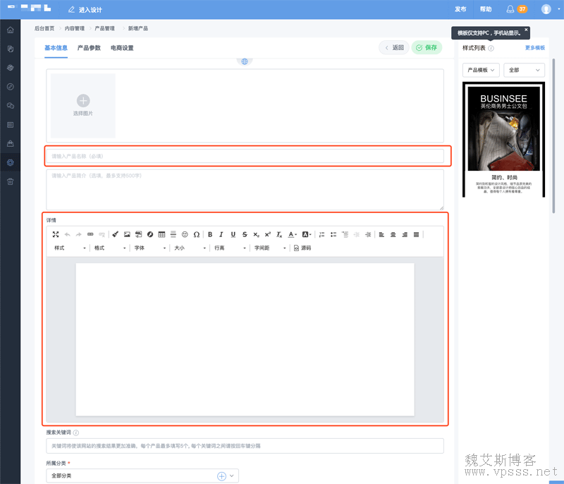 3、添加产品名称、简介、详情、关键字、图片、分类等,点击保存,产品就添加好了。